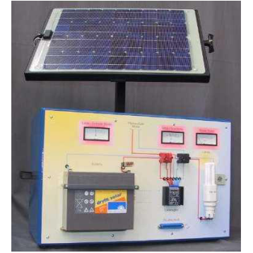 Bench-top module, completely connected. Enables illustrating principle of a photovoltaic unit. Solar array 48 W, mounting sheet metal with silver-screen print, main switch, rotatable and incline-able mounting rack for the solar module. Measuring instruments included.