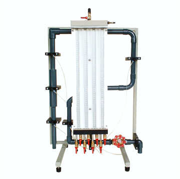 For measuring pressure drops at various flow rates when water flows through different pipe bends, with sudden expansion and contraction. Bends and fittings connected in series with pressure tappings on both sides of each device. Features water manometer with vent valve connected to tappings. Valve at outlet is used to control the flow. Optional gate valve with pressure gauges. Often used with the FM 100 Hydraulics Bench.
