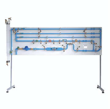 For the study of friction loss in pipes, pipe fittings, valves, and primary flow measuring devices. Includes water manometer and pressure tappings with quick connections. Water meter and variable area flow meter. Venturi meter, orifice meter, clear acrylic pitot tube. Mounted components include linear pipes, regular elbow, bends, gate, globe, ball and check valves, T-section, inline strainer, sudden expansion and contraction. Often used in conjunction with FM 100 Hydraulics Bench.