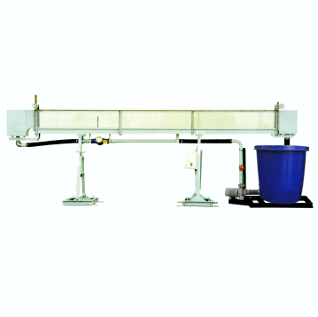 Self-contained open channel; 4m long (longer extensions available upon request); with rectangular cross section; 100-300mm; steel frame support. Transparent side walls. Tilting by manual screw jack -2 to +5%. Features stainless steel bed, storage tank, circulating pump, stainless steel head and end tank, stilling baffles. Water meter. Also available in 150mm width, or other custom sizes.