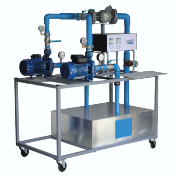 Self-contained bench for the measurement of flow rate, head, power input, and efficiency of two independent pumps. Two centrifugal pumps with two inverters with AC motor dynamometers and spring-balance/torque-wrench. Flow control valves and stainless steel piping for individual operation or series/parallel connection. Features include a water meter, digital pressure gauges, water storage tank, control cabinet, leak detector. Mounted on a mobile table.