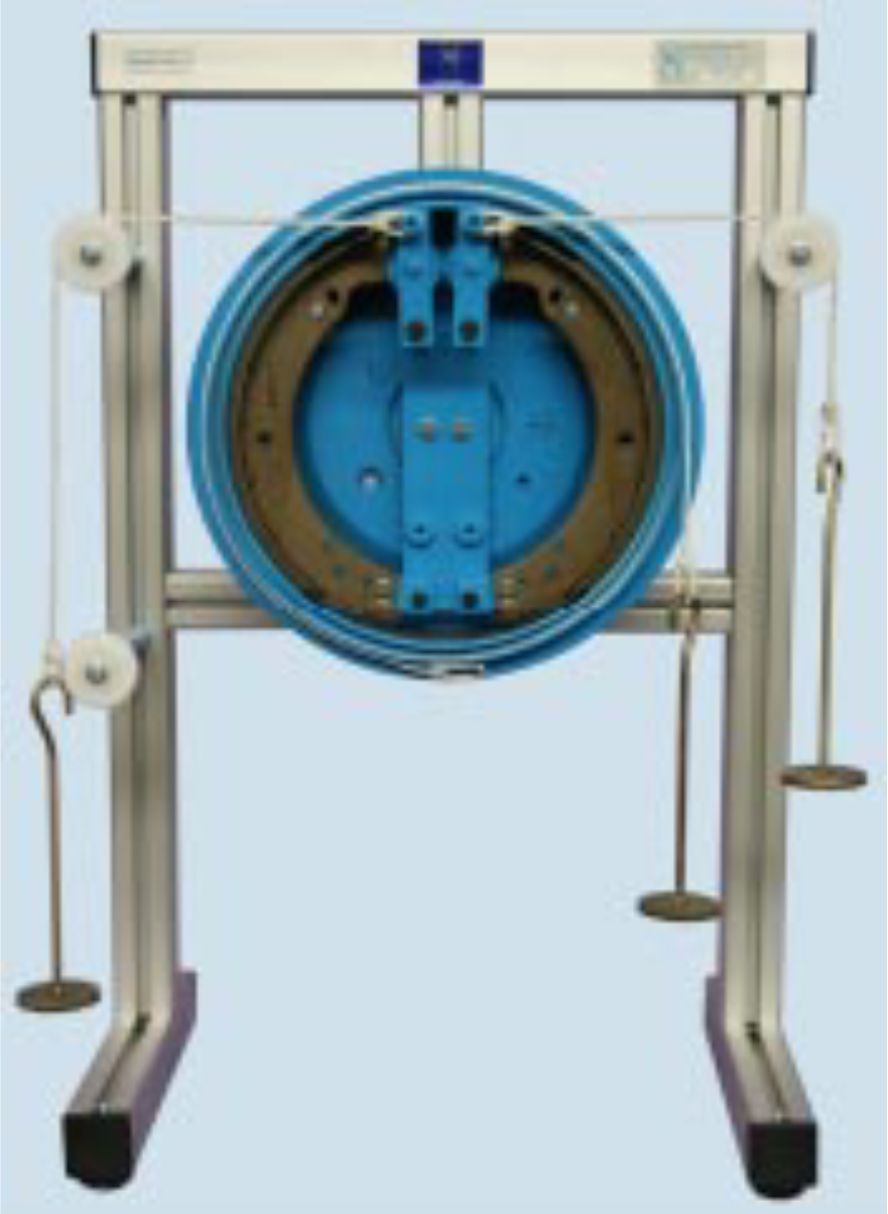 Wall-mounted, to investigate brake phenomena using real components. For pivoting and sliding shoes. Friction coefficient between drum and shoe. Shoes with an adjustable liner, load cords, hangers, D-S link and weight set.