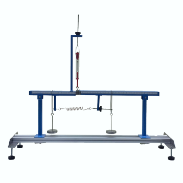 Two-part beam, simply supported. One part has ball bearings traveling on flat vertical surface of the other part. Overhung adjustable spring balance measures the shear force and underhung adjustable spring balance to resist bending moment. Movable load hangers fit around the beam. Set of weights included. Works with universal test frame.