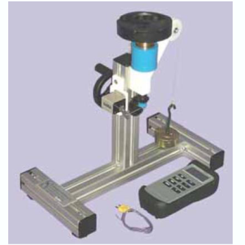 Bench-type, two brass cones that are closely mating, The outer cone is supported and held in an insulated cup, which is driven by a hand-wheel. The inner cone is partly filled with water and has a disc attached to the top. A fine load cord from this disc passes over a pulley to a load hanger. A weight is placed on top of the disc gives a suitable loading to the inner cone. A mechanical counter is actuated by the cup drive spindle and counts the cup revolutions. Mounted on a frame made of extruded aluminum profile. Digital thermometer type K, set of weights are supplied.
